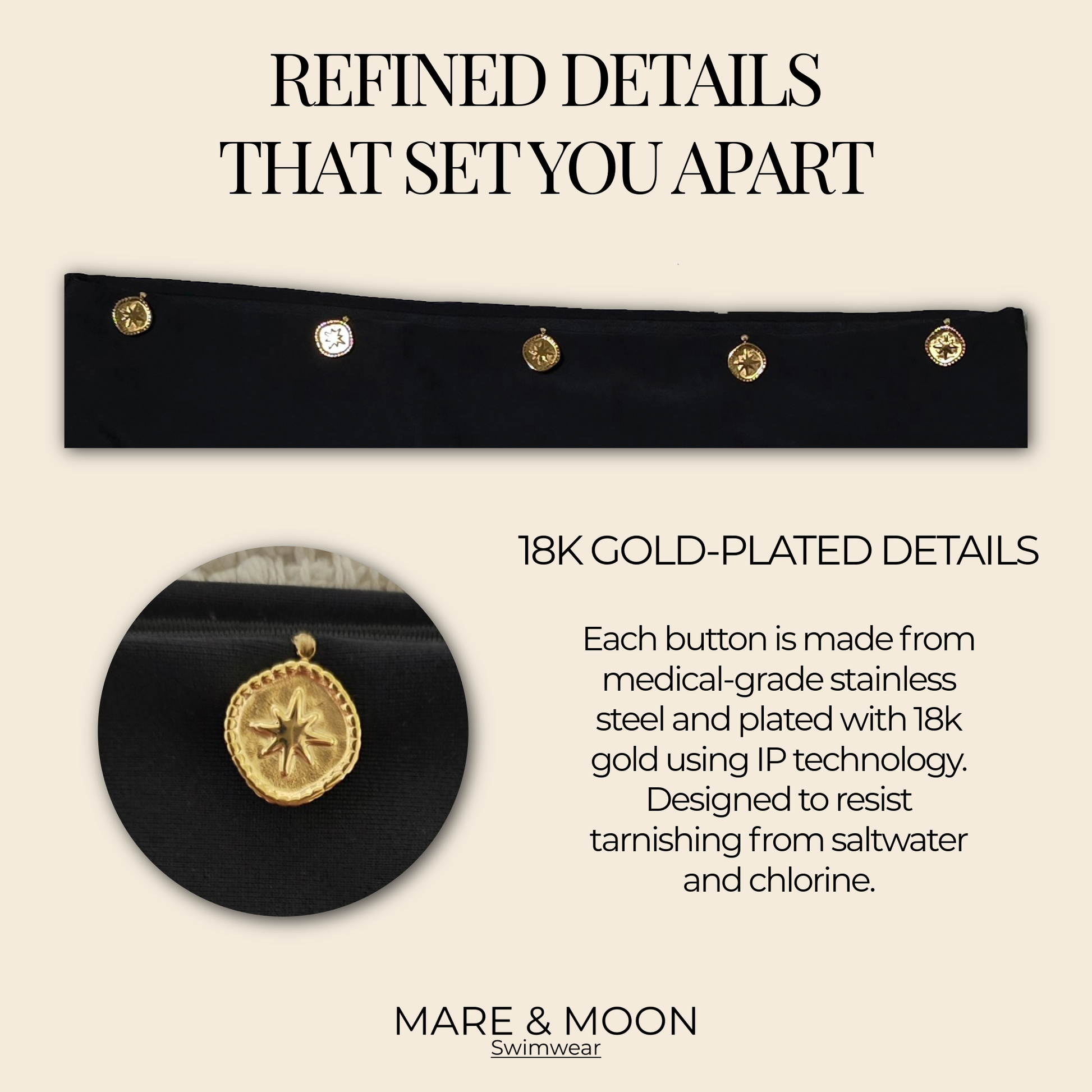 The knotted bralette-style top features a flattering V-neckline and adjustable straps for a custom fit, while the high-waisted bottom offers sculpting coverage and retro charm. Five front gold buttons add a striking accent — crafted from medical-grade stainless steel and plated in 18K gold using IP technology, ensuring long-lasting durability against saltwater and chlorine.