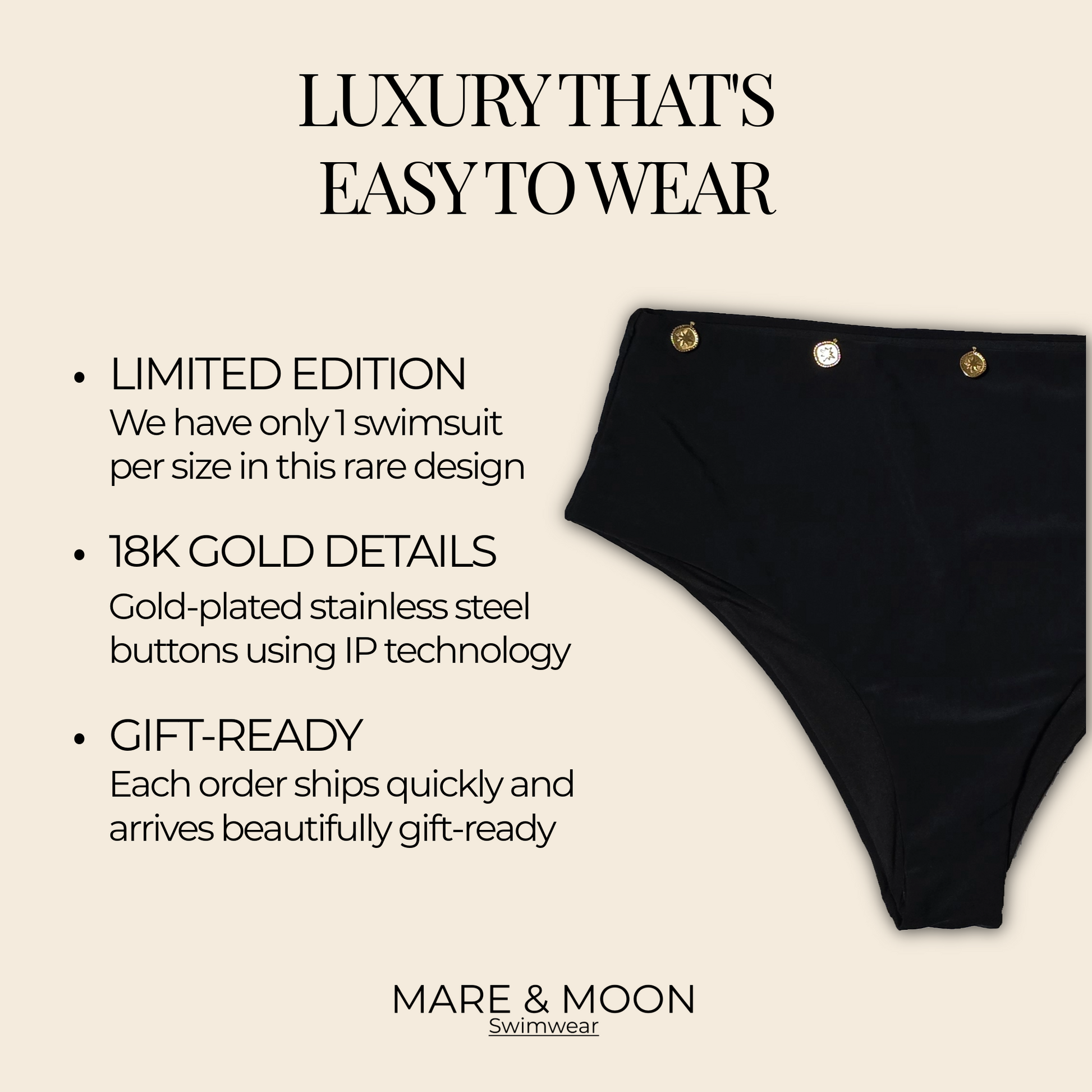 Introducing the Black High-Waisted Bikini Set by Mare & Moon Swimwear — a timeless silhouette reimagined for the modern woman. This limited edition design is available in extremely small quantities, with only one piece per size, making it a rare and refined addition to your swimwear collection.